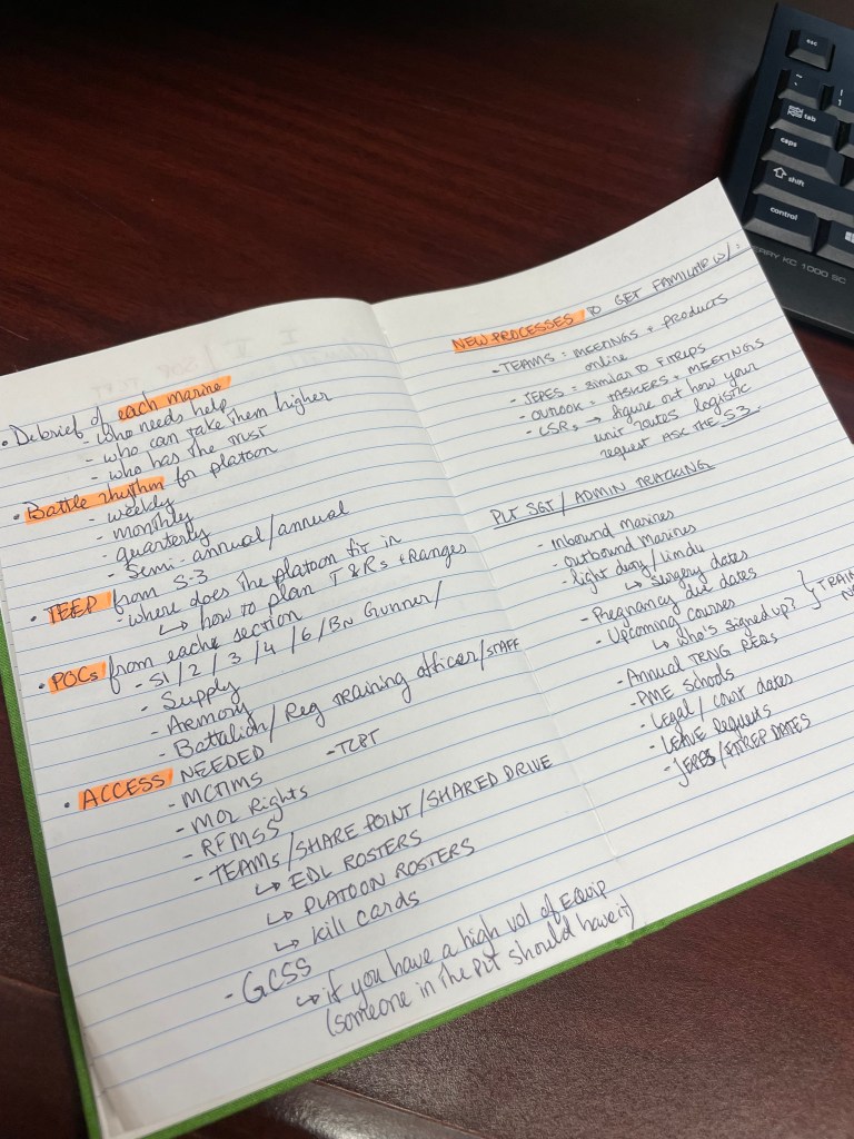 Checking into a new unit or coming back to the fleet after a few years tends to trigger growing pains. This applies to anyone stepping into a staff platoon/section billet for the first time. While you’re waiting to get access to your email and finishing your check-in, here’s an extremely basic outline on what to start focusing on the first few days/weeks. It’s a basic checklist to keep track of in your green monster. Applicable to any MOS – not meant to be in depth just a starting point.