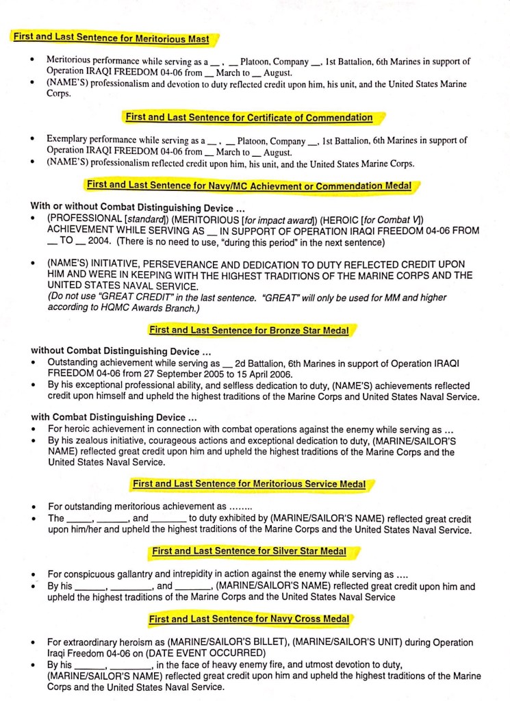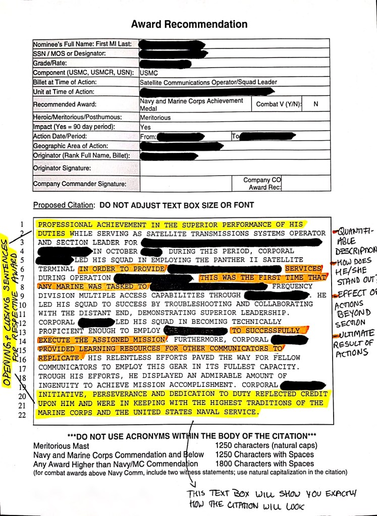 – Once you have a solid and reviewed summary of action (your platoon staff and senior enlisted advisor should review it and give feedback), you can start crafting the citation. Take the most impactful actions, look up the appropriate award opening and closing sentences, and you’ve got yourself an award.
