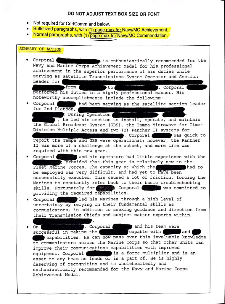 – Avoid fluff. If you don’t have enough material then it likely isn’t worthy of an award. Be to the point. Use concrete quantifiable examples and data that can show anyone, regardless of MOS, that the Marine’s work was impactful. Show how it affected the bigger picture – the company, battalion, regiment, squadron, etc. These should be accomplishments outside of their billet expectations.