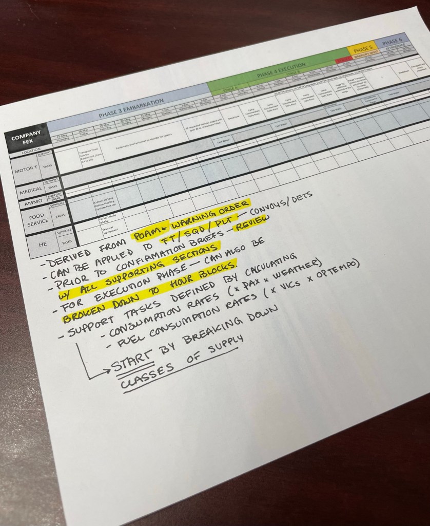Below are some simple sync matrixes you can use to ensure you got all your bases covered next time you execute. These can be applied to several different levels. The higher the level, the more logistical detail it will require. The smaller the unit, the better you can focus on the more finite time based details.